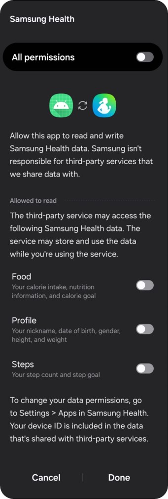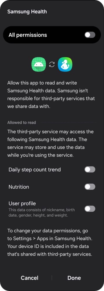 Ao solicitar permissões de dados com o Samsung Health Data SDK, a seguinte captura de tela será exibida ao usuário.